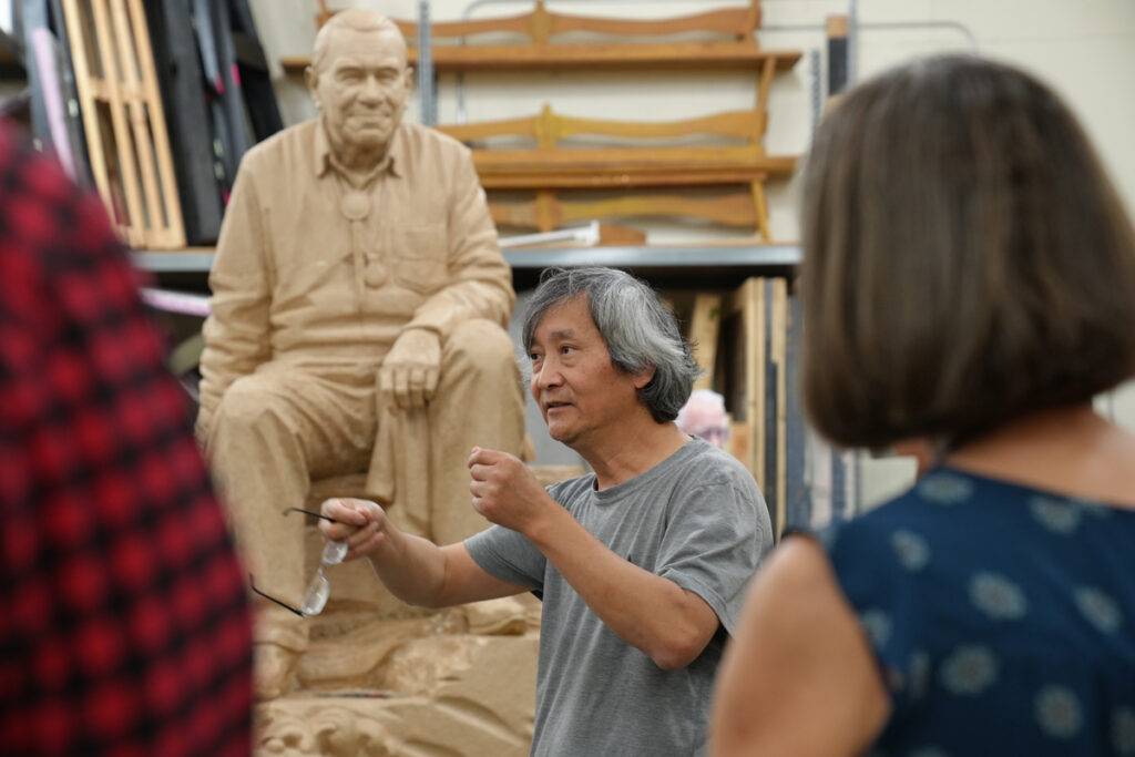 September 5, 2024: artist Haiying Wu addresses a group visiting his workspace. Wu has completed most of this work on the top half of the clay model. ArtsWA and the Nisqually Indian Tribe partnered with South Puget Sound Community College to host Haiying while he works. Thanks to this partnership, Haiying’s workspace is open to the public several days a week.