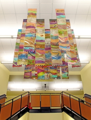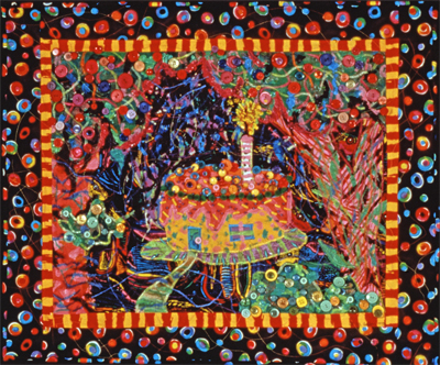 September is National Sewing Month! Here we feature artworks that include sewing as an important technique in their creation, often combined with other methods. The focus of these works are the elements of art (color, form, line, shape, space, texture, and value) and not simply the technique itself. However, the sewing technique itself is sometimes part of a statement as well: sewing has traditionally been assigned as "women's work" in many cultures. And the vast majority of these artworks are made by artists who are women. The range of sewing or stitching included in these artworks varies from being the main technique to barely visible stitching and appliqué used to embellish an artwork.