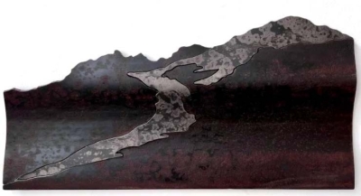 Lummi glass sculptor and educator, Dan Friday, and Bow-based sculptor, Aaron Loveitt, have both represented Mount Baker in the North Cascades mountains to speak to our local connection to its changing landscape. Friday’s Kulshan Bear is based on his familial connection to the land and the Lummi narrative of Chief Cuomo Kulshan and his two daughters (Mount Baker and the Twin Sisters), as was told to Friday by his Great Aunt. The bear is also a common motif in Friday’s work as a descendent of Frank Hilliare (Xa-Tel-Ek). Loveitt’s sculpted, metal relief, Recede, depicts the headwaters of the Nooksack River at the summit of Mount Baker, a view of the southwest face of the Deming Glacier. The artwork title “Recede” alludes to the dramatic recession of the glacier, that is undergoing rapid change. Both artworks, which are on view in the Ferndale High School Learning Commons, offer continued conversations on the everchanging mountain-scapes in Northwestern Washington.