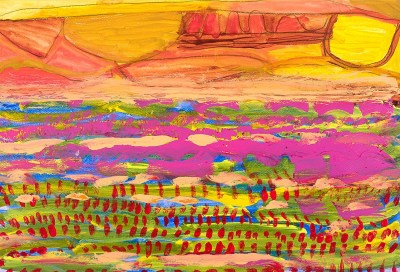"Every curated project starts with a seed, a central and pivotal point from which the collection flows in more than one direction. At the Kessler Center, it was important that the art collection should reflect, mirror, and uplift the mission and the daily experiences of the dedicated staff, and the families that come through the center. The seed, in this instance, flowered through the work of Beth Anna Margolis, a painter and poet from Bellingham, Washington. Her story reached and moved members of the committee (Margolis also has Down Syndrome). The work of Margolis became the original motivation for an art collection based on joy, color, and the inclusion of a marginalized population within the arts community. It was critical to the project and to the committee that my research be inclusive, and that the collection celebrate artists who are experiencing disability – whether physical, neurological, or intellectual – and use the transformative powers of artmaking to transcend, to heal, to rejoice.