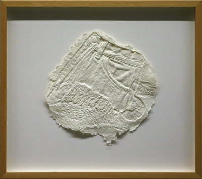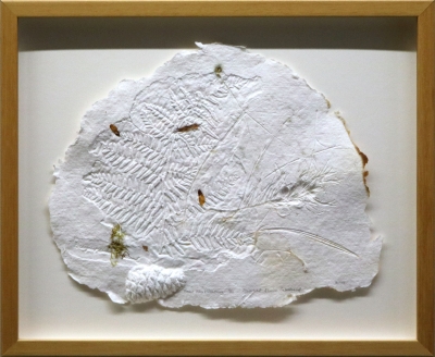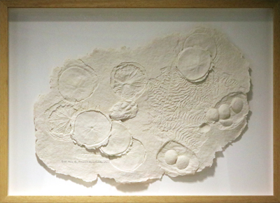 Margaret Ahrens Sahlstrand (1939-2023) was one of the main artists working with handmade paper in the Northwest. She often used organic objects and clothing in making her paper relief artworks. She notes, “My images come from my immediate environment which is rural. The objects, plants, and animals represented are important to me as strong visual images as well as for my own personal fondness for them. By interpreting my environment into paper form it may be enjoyed beyond its own life span.”