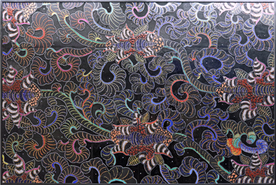 Elissa Greisz is a Port Townsend, Washington-based artist who creates abstract mixed-media wall sculptures, paintings, and weavings. Her work emphasizes intricate patterns. She notes “I borrow from Byzantine art, my Mexican heritage, sci-fi illustrations, other art, ornamentation, jewelry and tattoos. And the transformation of inert materials becomes my modern-day alchemy.”