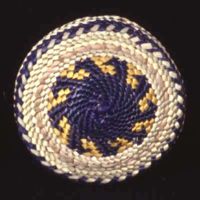 Round Basket (4) is part of a series of five colorful traditional baskets woven by Native American artist Lena Johnson. This artwork is part of Beyond Blue Mountains, a collection that was curated by late Tlingit (Native Alaskan) artist Jim Schoppert. It presents the work of Native American artists of diverse heritage, ideas, materials, and styles. The collection takes an in-depth look at the artists’ unique voices and interpretations of tradition.