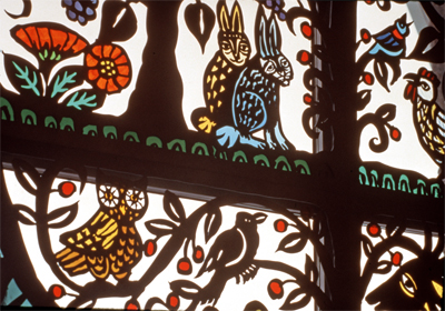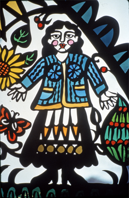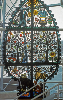 Tree of Life is a laser-cut steel and "grisaille" stained glass window created by artist Cappy Thompson. She created it for the Washington State Patrol Headquarters in Union Gap, Washington, along with another laser-cut steel sculpture called 'Yakima Valley Parade.' This composition features many plants, flowers, animals, and human figures. The design shows the interconnectedness between all living things. The "Tree of Life" connects all forms of creation, and it is a story found in many cultures all around the world. To create the design, Thompson input her drawings into a CAD (computer-aided design) computer program. This program translated the drawings to a laser-cutting machine. She then filled the laser-cut figures with colorful stained glass.
