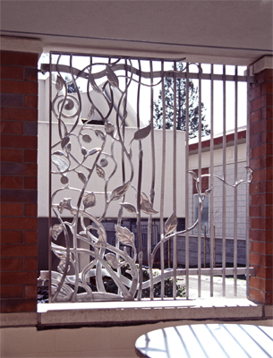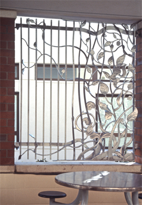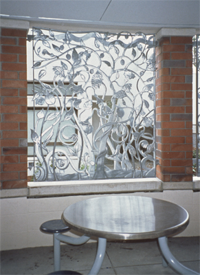 Artist Wayne Chabre designed Transformation to soften the interior environment of the family visitation area at Western State Hospital in Tacoma. The three metalwork panels include plant motifs of sunflowers, thistles, and trees.