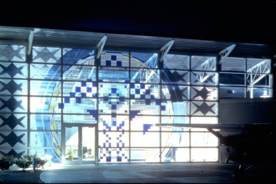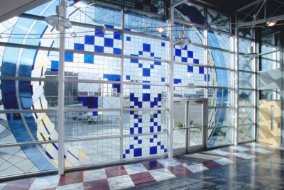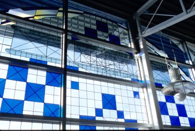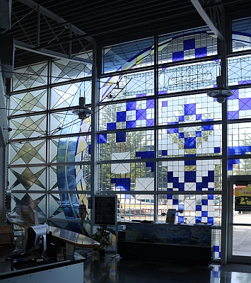 Artist Jack Archibald created the stained glass artwork Circumnavigating the Century for Clover Park Technical College's School of Aerospace and Aviation. The abstract designs references aviation imagery. The window and its symbols complement the building's architecture and use aviation as a source of information and inspiration. Students in the aviation program can study toward becoming a pilot or a variety of technical and mechanical certifications.