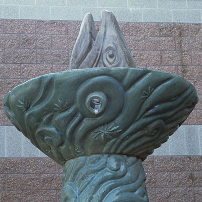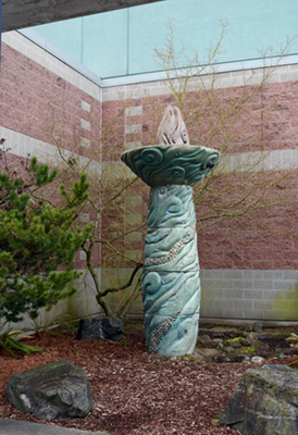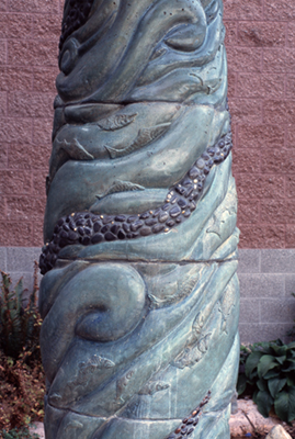 Artist team Peter Goetzinger and Glenn Herlihy created Salmon Garden for Henry M. Jackson High School. The interactive sculpture and landscaped garden educates students about the salmon ecosystem. It is comprised of a fountain sculpture featuring the salmon life cycle spiraling up the column. At the top of the column, a basin fills with water spouting from a salmon's mouth. Viewers can start the flow of the fountain using a hand pump nearby.