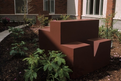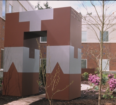 Fragmentation - Reassembly is a conceptual sculpture created by artist Norman Courtney. The design references the ideas of French psychoanalyst Jacques Lacan. In Lacan's psychotherapy model, a patient's fragmented thoughts are reassembled into a healthy "whole" state. The artwork is comprised of a bench and an arched passageway, symbolizing the Western State Hospital's mission to move patients out of the mental health facility and back into the community.