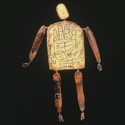 The Gift This Time Around is part of artist Morgan Brig's figurative sculptures created from copper and glass-enamel. She formed the figure by cutting, hammering, heating, and cooling copper sheet metal. She repeated this process until achieving her desired forms. She then baked enamel onto the copper using a torch, drawing imagery into the melted surface. She notes that this piece is "about the belief that we are all given a specific talent or gift for each lifetime that we live on earth. The palmistry imagery on the torso is to suggest how that gift is very unique and imprinted upon each of us in a comprehensive manner. It is the belief of the artist that it is up to each person to discover what their own gift is and to then use it to the best of their ability during their lifetime."