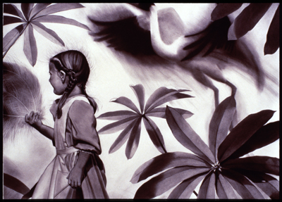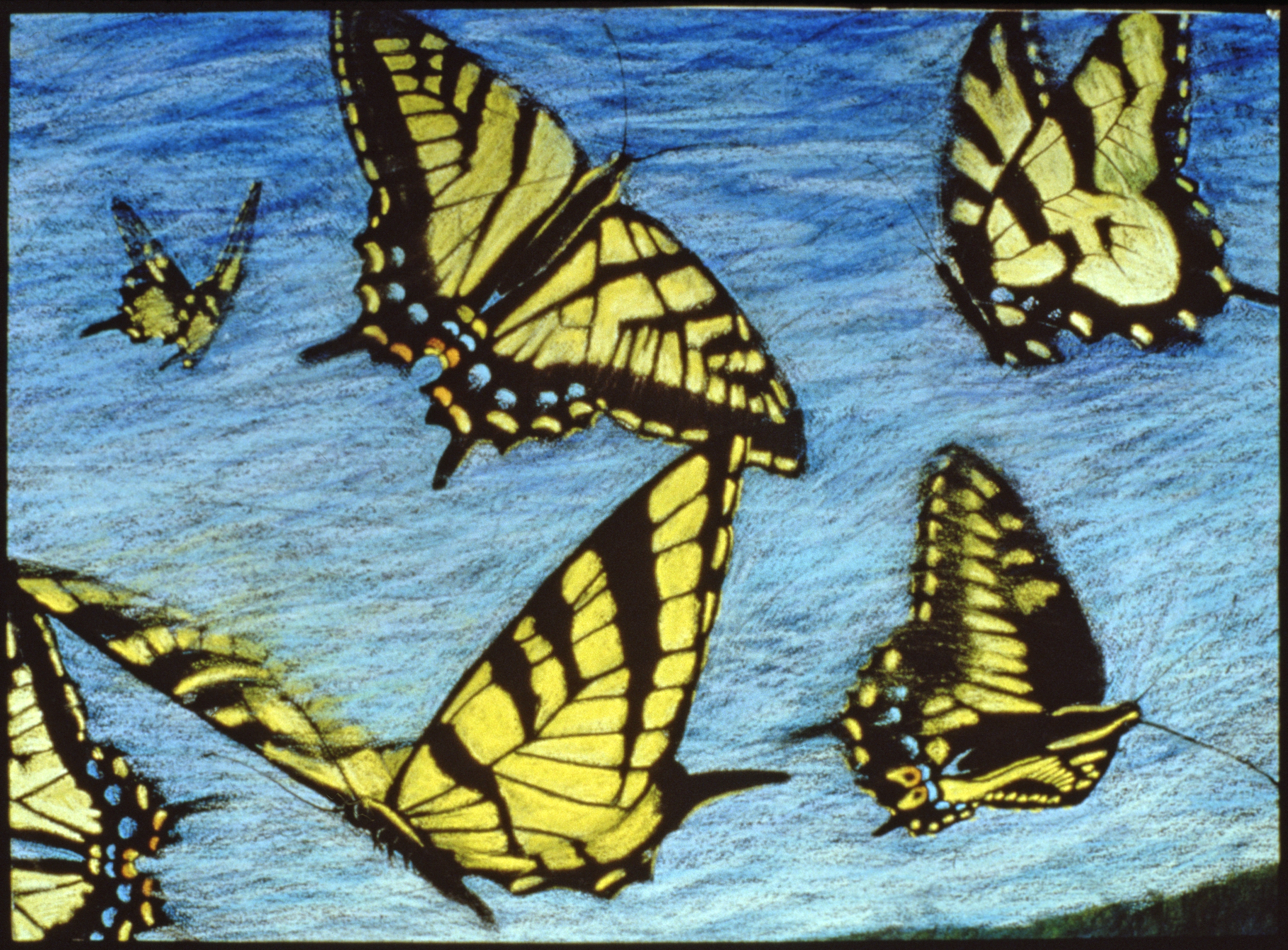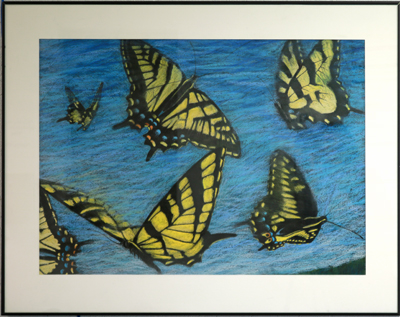Swallowtails is a painting by artist Debra Davis. She began it in the summer while working for the Forest Service trail crew in Cle Elum, Washington. After a snowy and wet winter, she noticed an unusual number of Western Tiger and Mountain Swallowtail butterflies on the trail. She notes, “When fall came, I sat down to draw the butterflies and I knew they had to be larger than life. I referred to photographs for the shapes and markings. I made a model butterfly that hung from a string so I could see how to draw it from different angles in flight.”