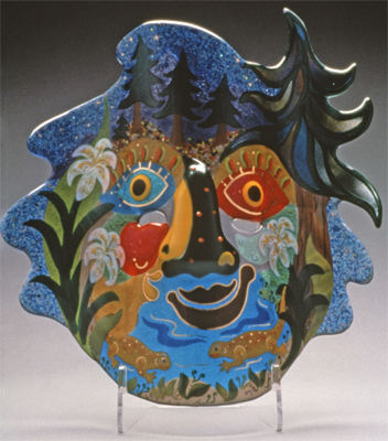 Spring Renewal with Salamanders is a glass mask created by artist Ruth Brockmann. It is part of a series of masks that celebrate the connections and relationships shared by all living creatures. This piece is inspired by the Salamander, which reappears after winter hibernation as one of the first signs of spring. Brockmann noted, “Over many generations it has been symbolic of rebirth and renewal. According to folk belief of the Middle Ages (approximately 450-1450) the salamander was an elemental spirit that could live unharmed in fire.”