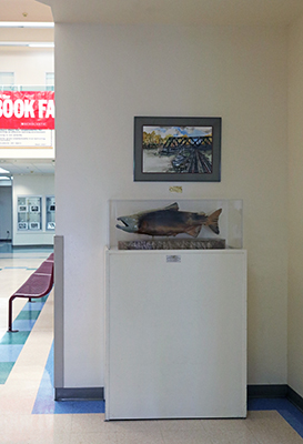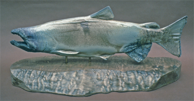 Patriarch II is a ceramic and wood sculpture created by artist Ken Lundemo. His early memories fishing with his father during the Great Depression of the 1930s inspired this piece. He notes, "My Dad was supporting our family fishing during the day and selling the fish around the neighborhood in the evening. Times were tough but fresh salmon brought to the door of those homes in the North end of Tacoma was hard to refuse. . . I have fished salmon all my life on Puget Sound and the waters of Washington State and have come to have a great respect for the history and culture of the Native Americans and their relationship with the salmon in this region. The life cycle of the Pacific salmon is truly awe-inspiring and it is easy to understand why they have been revered through the centuries. Salmon· have provided nutrient for the forests and waters of the North West as well as food for generations of peoples since the Ice Age."