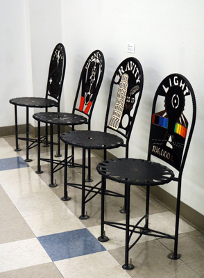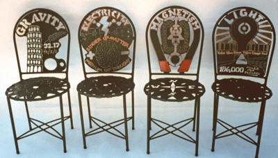 Forces of Nature Chairs are a series of four chairs created by artist Reis Niemi. Each chair features a design centered on the world's basic forces. The designs include electricity, gravity, light, and magnetism. Niemi notes, "I was working on another chair, a portrait of Isaac Newton, and it gave me the idea to do these. Actually, all of these forces can be related to each other through mathematical equations, some of them solved by Isaac Newton, some by later scientists such as Einstein."