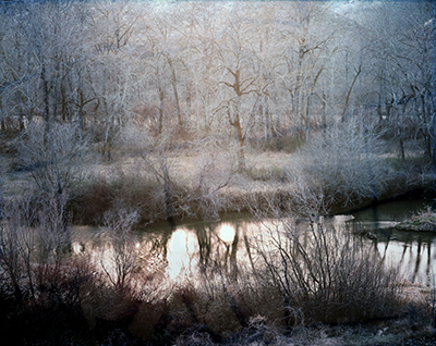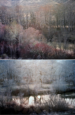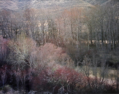 Silver Fantasia Diptych is a two-part photograph captured by artist Neil McWee in the Yakima River Valley in Washington. He took the images in winter, and are part of a larger body of work about deciduous forests. He notes, "The eastern part of Washington is often unappreciated for its scenic beauty and color. Its contrast with the western part of our state offers grand space and open feeling. A prehistoric lake created Eastern Washington. Its draining caused the Columbia River Gorge and the landscape of eastern Washington. The unique geology has created visual splendor unlike other places in the world."