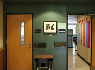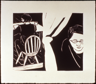 Artist Pat De Caro's linoleum cut print Proximity depicts two figures separated by a curtain, and is composed to highlight a graphic style and strong contrast between positive and negative space. The artist notes that the piece suggests a narrative about interior and exterior space. She notes that this narrative "refers to a changing relationship between inner and outer realities, and the influence of memory on our perceptual experiences."