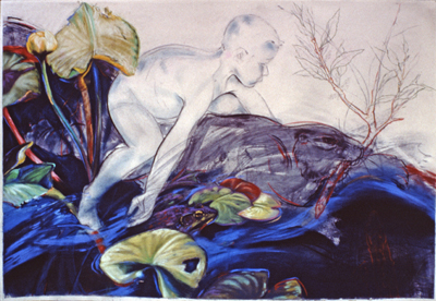 River Journey I is a painting by artist Kay O'Rourke. It is part of her body of work inspired by the wildlife on her Eastern Washington farm called Wake Robin's Rest. A beaver lives on her stretch of river. She notes, "I did a series of paintings, drawings, and mixed media sculpture on hum, using his tree trimmings to build sculptures and my grandchildren's interest to tell stories. He took the children on an underwater journey of the river – showing how he and his family contributed to the health of the river eco-system. In some ways it was like a folk tale."