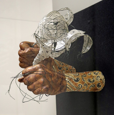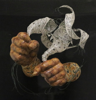 Grip is part of a series of sculptures by artist Kathy Gore-Fuss that combine the human form with objects and natural elements. The forms are embellished with dried flower petals and relief prints using materials such as antique lace and bird feathers. This piece features Clematis flower petals to create the surface of the hands. The form held by the hands was created using printed silk tissue. The artist notes that this piece "attempts to capture the essence of an individual's struggle and the question as to whether it is internal or external."