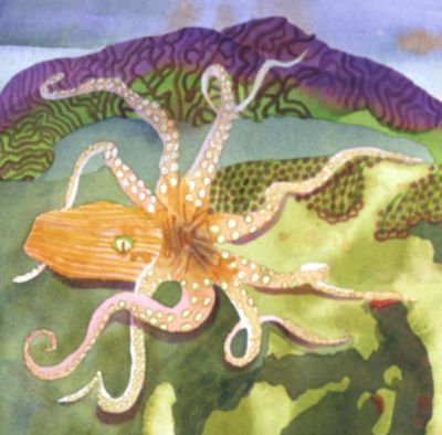 Octopus Garden features colorful and stylized underwater imagery. Shani Marchant created this watercolor painting to "provoke reflection, wonder and storytelling for the audience."