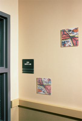 Part five of artist Karen Guzak's installation at South Seattle College, 'Hidden Quotes' consists of eighty unique digital prints scattered throughout the college library. Each print includes a thought-provoking quote on its surface. Guzak's five-part installation celebrates technology and the value of work. It is interactive in nature as students will walk through and around the artwork parts and read the artwork's words, and it is unified by the motif of circles and arcs in the artwork as well as in the students' paths around it.