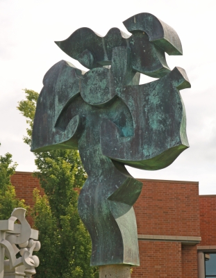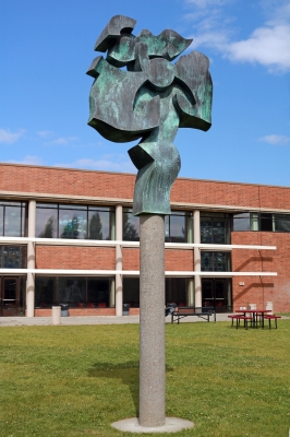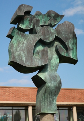 Circle of Friends is comprised of five sculptures created by artist Harold Balazs. Each piece features exuberant abstract forms composed from a different type of metal. This one is made of copper. The sculptures are placed in Mt. Spokane High School's courtyard, encouraging friendly gatherings within the space.