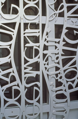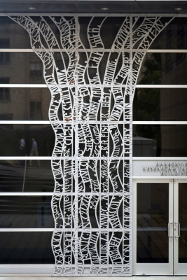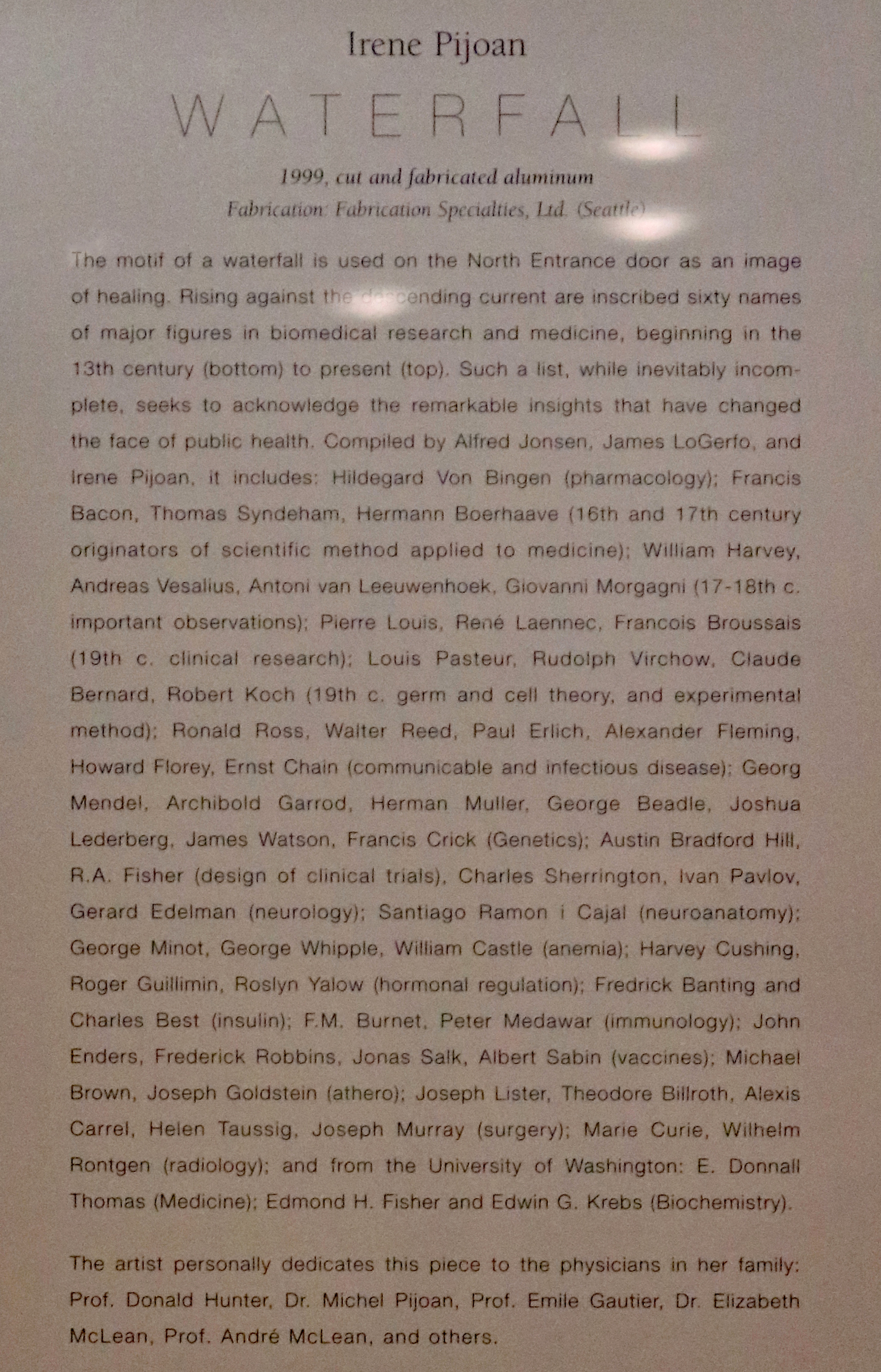 Waterfall is part of a three-part installation by artist Irene Pijoan. The three artworks conceptually depict different human systems and relate to the medical specialties at Harborview Medical Center in Seattle. The artwork is about healing and lists the names of sixty people who have been important to biomedical research and medecine, from the 13th century (at the bottom) to the present (towards the top). The artwork honors the medical advances and ideas that have changed public health. It is installed at a side entrance that is used by doctors working in the building.