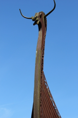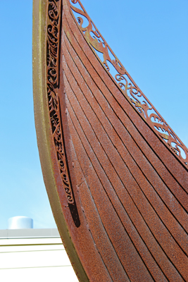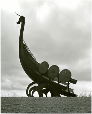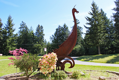 Ken Lundemo created the first artwork in Washington's State Art Collection's in 1975. His Viking longboat-style sculpture refers to the Scandinavian theme of the city of Poulsbo, where this artwork is located. The sculpture represents the forward third of a ship rising on waves. Lundemo researched the Vikings and Scandinavian boat building techniques. He built it in a similar way but using welded steel instead of wooden spruce root ties.