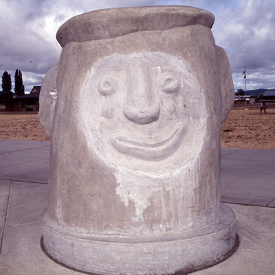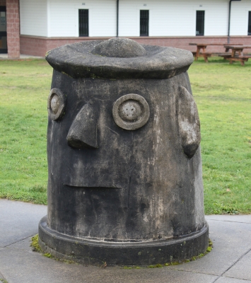 This piece is part of artist Garth Edward's group of sculptures installed throughout Green Hill School. The school provides education and vocational training for young male offenders as part of Washington's Juvenile Rehabilitation program. Using many different materials, Edwards fills the campus with imaginative and affirming imagery. A mural installed in the visitor's center shows the journey to learn a skilled trade and graduate. Painted aluminum sculptures of plant forms suggest growth and renewal. Concrete 'heads' look out over the grounds like protectors. Four aluminum benches at building entrances feature whimsical bear figures. Aluminum cutouts celebrate the many learning opportunities open to residents. Windows patterned with prisms cast rainbows into the interior spaces of the buildings. Together, these sculptures integrate into the facility and set a positive tone for resident rehabilitation.
