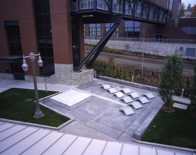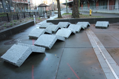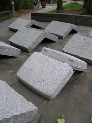 Terminus is located at the heart of the University of Washington Tacoma campus. The artwork consists of several balanced abstract suitcase forms among one realistic suitcase carved from granite. The sculpture represents Tacoma's place as the western end of the Northern Pacific Railroad.