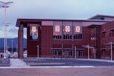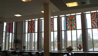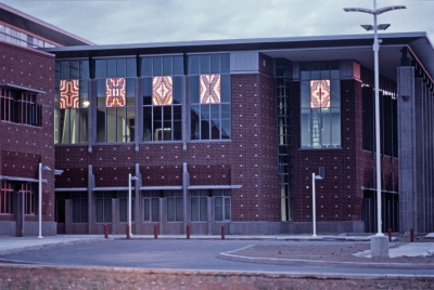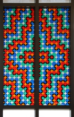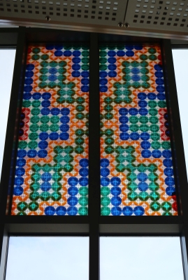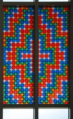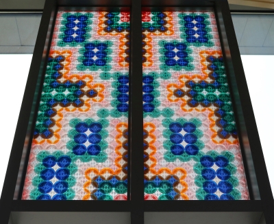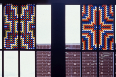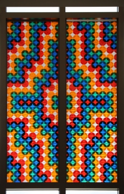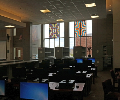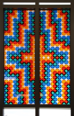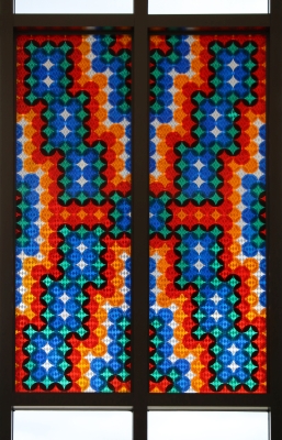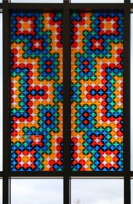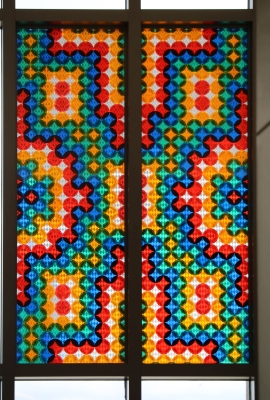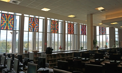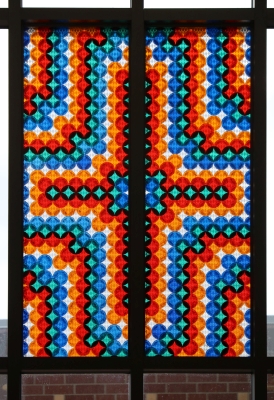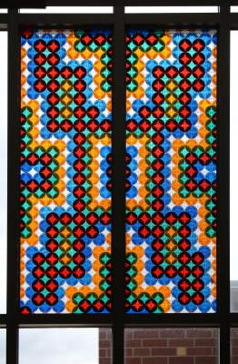 Each of the fourteen window sets of Reflective Light Rhythms have intricate geometric designs. The window patterns interact with each other while accentuating and blending into the glass, pillars, and bricks of the architecture. The rhythm of reflective designs and landscape seen through the clear glass creates a dramatic and kinetic light experience, during the day and when lit up at night. For students in the library, the installation is like stained glass windows.
