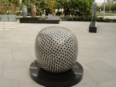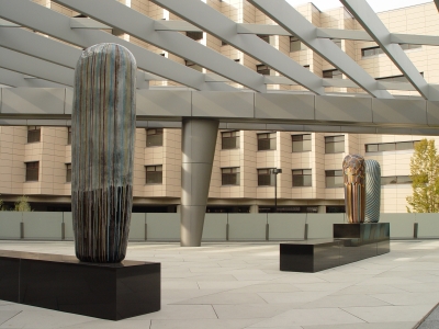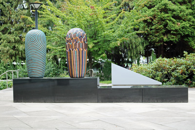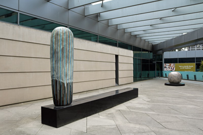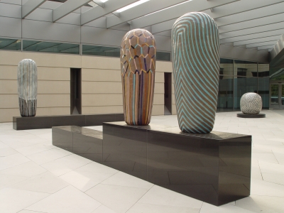 Sculptor Jun Kaneko is known for his very large, hand-built clay "dangos" (meaning "rounded form" or "dumpling" in Japanese). Reflect encourages viewers to examine their environment and focus on a sense of scale and place. Kaneko was originally a painter and is still interested in surface patterns that are repeated and abstract. The shape of each ceramic piece suggests its own decoration to him, and he notes that "I almost always have a need to paint on it." Kaneko's dangos can be up to eight feet in height and need to dry for several months before being fired in the kiln.