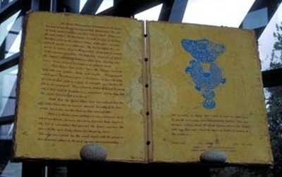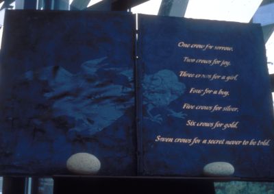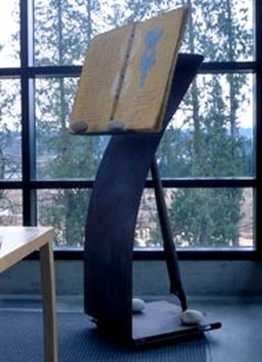 Rare Books is a set of four hand-bound books created by artist Linda Beaumont. One book is displayed at a time, rotating with the changing of the seasons. They are displayed on a podium placed within a shrine. Written by the artist, the books consider the cycles of the four seasons and reference Native American mythology and natural science.