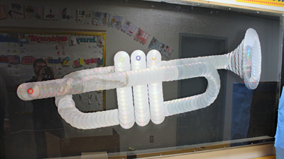 Artist George Radebaugh created the sculpture Cornucopia out of used Compact Discs. It is part of a series of musical instrument forms. He notes, "I try to use all scrap materials when available. The overlapping technique that I have often employed in my work lately suggests fish scales. As the viewer moves the light and color reflected by the piece changes greatly implying a motion in the otherwise still work."