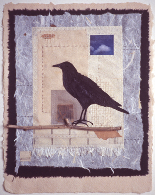 Patch of Blue is comprised of assembled and stitched silk fabrics, handmade paper and found objects. This piece is part of artist Marie Hassett's "Corvus" series focused on the depiction of the common crow. She notes that the crow in these works is "used as a creature of wisdom and strength often possessing magical powers. Animals are instrumental in the visual narratives I create in telling stories and the complexities of the human journey."