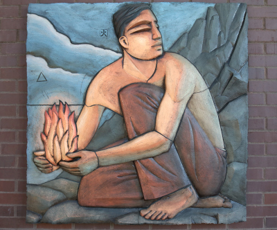 Each square panel of this piece personifies one of the four Western elements – Earth, Air, Water, and Fire. The imagery and patterns represent cultural traditions from around the world, "a reference to the universality of scientific thought and discovery."