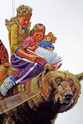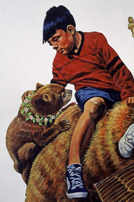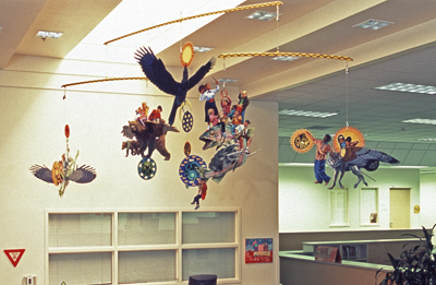 This artwork is part of ‘Raven Spirit Mobile’, a five-piece mobile created by artist Terry Furchgott. She created it for Illahee Elementary as a tribute to the school’s values and the area’s Native American heritage and history. A mobile is a sculpture that hangs balanced in the air with each part moving freely. This sculpture features five different winged animals. The animals represent important symbols in the cultures of the Native American Tribes of the Pacific Northwest. In each part, a circular emblem shows an image of the animal inspired by the artistic style of the Northwest Coast. This part features a brown bear with adults and children riding on its back. It symbolizes respect shared between man and animals. The artist notes that the bear “in this mobile represents the Earth. Children and bear cubs are shown here helping and taking care of each other as they ride on the bear’s back…”