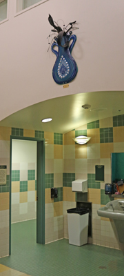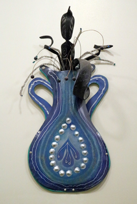 Part of artist Katherine Holzknecht's series "Industrial Bouquets," comprised of mixed media wall sculptures, Amphora Moderna uses plastic tubing, wires, beads and glass to depict permanent and unfading flowers in a vase made from shaped aluminum. The vase was inspired by the amphora vessel used by Greek tradesman to carry olive oil and other goods.