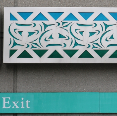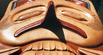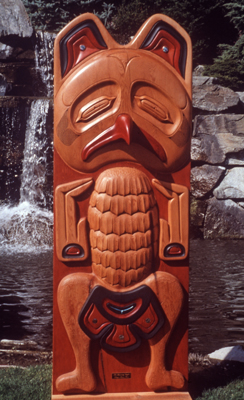 Native American artist Frank Fulmer created the hieroglyphic sculpture Eagle Dancer from old growth western redcedar wood and abalone shells. It was carved using traditional tools. It depicts a Tlingit (Native Alaskan) chief dressed in ceremonial regalia, who transforms into an eagle as he performs. Stories from the Chookaneidie Clan of the artist's Tlingit heritage inspired the sculpture. The clan was forced to move from their homeland of Glacier Bay, Alaska, during the advance of the ice age hundreds of years ago. After Glacier Bay became a national park, the clan's traditional hunting rights in the area were revoked. The artist Fulmer notes, "To this day, the Tlingit Chookaneidie people carry on the fight against the U.S. Government to gain back our identity and legacy which is one with Sit'Geey, our homeland that has rightfully belonged to us for over 9,000 years.