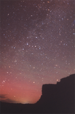 Lower Grand Coulee is a long-exposure photograph by artist Michael Williams. It is part of his series of night-time landscapes that he calls "Stellarscapes" that he began after camping in the Cascade Mountains in 1989. This photo was taken at night using a combination of planned techniques and spontaneity, including holding the camera shutter open for up to four minutes. Commenting on why he does it, Williams notes that "Ever since my childhood home in Tacoma was wiped out by I-5, I guess I've been looking for my place in the universe… it's a good excuse to stay out all night. Mostly, though, I'm still hoping to find my place in the universe."