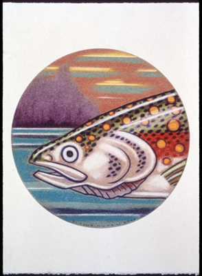 Trout is a drawing by artist Dennis Cunningham, and is part of a body of work that explores our relationship with the environment of the Pacific Northwest. Describing his compositional style, Cunningham notes, "my use of familiar images- infused with signs, symbols, and contemporary formal and thematic visual elements- is intended to serve my complex reflections on the subject of trying to find meaning in our relationship with the natural world."