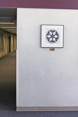 Magpies Looking Out is a linoleum block print by artist Debra Davis. It is composed to highlight radial symmetry, a visual concept she taught as part of a design course at Yakima Valley Community College. The imagery is inspired by the high-contrast feathers and long tails of the Magpie, a bird the artist observed while walking in Cowiche Canyon.
