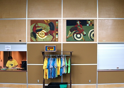 Concentricks #1 is part of artist Jane Burns' series of paintings that feature twins, and it is displayed alongside 'Concentricks #2.' These works explore themes of cooperation and trust. The movement and curved, circular forms imply that the characters support and complement one another,