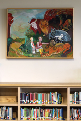 Peaceable Kingdom (after Edward Hicks) by artist Elizabeth Sandvig features many different animals and human figures posed together in pastoral, peaceful harmony. The painting is a direct adaptation of a well-known painting by the American Folk Painter Edward Hicks. The idea for Hicks' "Peaceable Kingdom" was inspired by the Book of Isaiah (from the Bible's Old Testament) and the passage "the wolf shall dwell with the lamb, and the leopard shall lie down with the kid." It is about the promise of a future era of global peace and harmony, an era free of conflict and hardship.