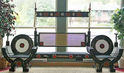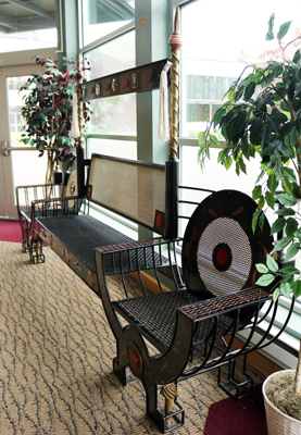 Artist Brian Swanson created Nouveau Banquette using hand-bent steel pipes, mesh, and perforated steel sheets. The title and design of the bench reference Art Nouveau, an art movement of the late 19th and early 20th century. Art Nouveau had a unique style referencing natural forms and design elements from different world cultures. It focused on simplicity, beauty, and craftsmanship. Swanson notes, "This piece was based on a design by Carlo Bugatti from around 1900. His designs had Moorish and Far Eastern influences, using a variety of materials: polished metals, silks, carved wood and paint. […] His version spoke to opulence, while mine refers to popular culture." Swanson painted the bench and sprinkled it with glitter. He added automotive reflectors and grill badges as decorative elements.