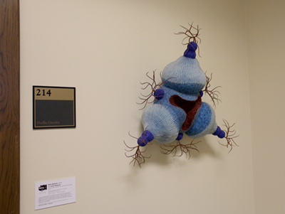 Blue Hydroid is part of artist Lanny Bergner’s series of mixed media sculptures created using gourds the artist grew at home. He harvests, cures, and cleans the hollow gourds before reconstructing them into fantastical sculptures. He created the textural surface of this piece using crushed glass and by applying silicone glue into a meticulous pattern. Inspired by botanical and aquatic forms, he notes, “The sculptures mainly come to life by creative evolution, whereas one form will initiate the thought for the next form.”