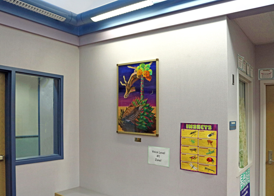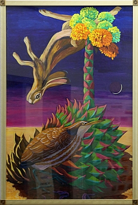 Agave and Moon is a colorful figurative painting by artist Janet Essley. This painting is based on a poem the artist wrote while studying the wetland habitat of the Pacific Coast in Baja, Mexico. Describing the imagery, she notes "The shy and rarely seen bittern resides in tall reed marshes, the octopus in the inter-tidal rocks. The agave is a desert [plant] that grows for years, then blooms once with an enormous flowered spike and dies. One was blooming next to our research site within yards of the bay and I had made sketches of its exquisite geometry. All these creatures and many others are threatened by development of the coastal areas for human needs and consumption."