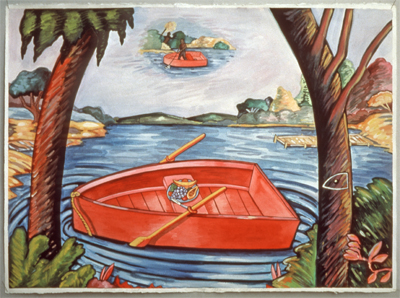 Red Boat is a colorful narrative painting by artist Donna Mossholder. It combines landscape and dream-like imagery. She notes, “I wanted to express the attitude of stillness and tranquility surrounded by a chaotic force of energy, a secret and interior space like the calm in the eye of the hurricane or the subconscious in the center of conscious activity and turmoil.”