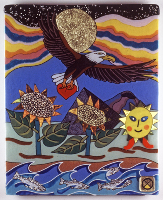 South is part of artist Richard La Londe's series of fused glass wall sculptures that illustrate his children's book "Heart of the World", which he self-published in 1994. This panel depicts the following passage: "Arm in arm they looked south to the land of heat. They saw smiling sunflowers, soaring eagles, and frolicking adult salmon in the ocean. It was a land of enterprise at a time of production. The sun was hot and life was strong and vibrant. They sang: 'South is action'."