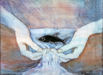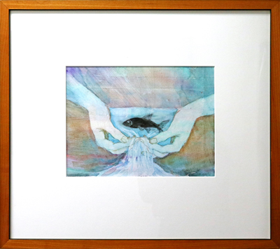 Holding Pattern is part of artist Barbara Black's body of work featuring dream imagery and water as a symbol. This piece presents many spiritual and nature-based symbolic layers. She describes it as "the dreamer's hands in the waters of the unconscious capturing and protecting the emotive symbol—in this case, the fish. The fish has so many symbolic meanings which it has gathered over time and cultures that other interpretations may seem as true for the viewer. Several months after I first exhibited it, it occurred to me that an important meaning would be to represent our need to preserve and protect (as symbolized by the enclosing hands) the threatened species in our environment—such as both fish and fisherman. Still later, I was reading the hands and the water sliding down from the fingertips as a goblet enclosing the water and fish, a more spiritual symbolism.”