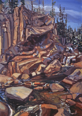 Place of the Falls is part of a group of paintings created by artist Janette Hopper while an artist-in-residence at the Montana Artist Refuge in Basin, Montana. The imagery depicts a waterfall along Cataract Creek. She notes, “Evidence of the history of the creek catapulting down the rocks is apparent in the formation of the rocks. The water is clear and fresh and active and the coolness of the shadows from the deep vertical landscape is clear in the hues and shades of the paint. The trees seem to grow up in a continuum to the sky.”