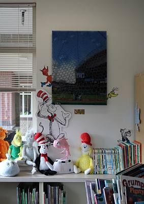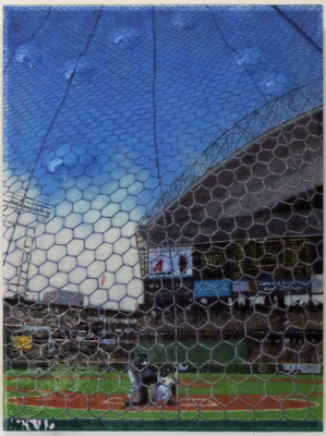First Pitch is a glass painting by artist Michael Dupille. The artwork commemorates the opening of Safeco Field in Seattle. The artist notes that games and sport are a recurring theme in his work, describing them as "unpredictable, emotional and generally full of color and movement; all elements which translate successfully to the world of art." He creates his “glass paintings” using different colors of crushed glass called "frit" which he layers and fires in a hot kiln.